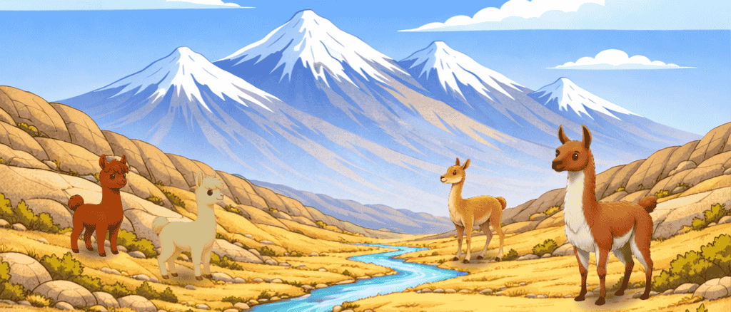 Romeo und Samurai sind endlich in den Anden angekommen. Am Dorfrand entdecken sie eine friedlich grasende Alpakaherde – neugierige Augen, weiche Wolle und ein leises Summen aus dem Tal. Für die beiden beginnt ein neues Abenteuer zwischen Bergen, Traditionen und neuen Freunden.
